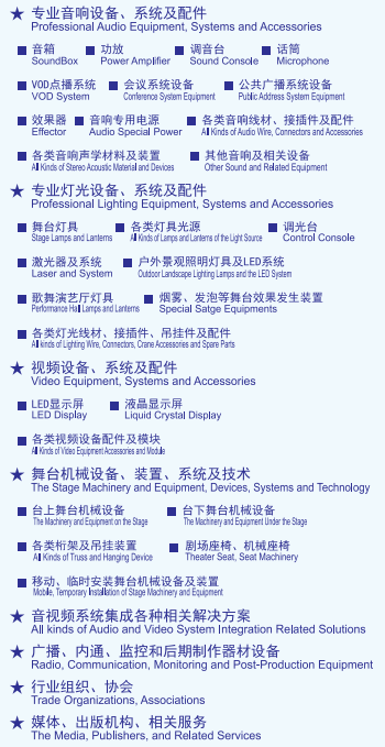 展會囊括了國際演藝設備行業的高新科技和最新產品,包括專業音響、專業燈光、舞臺機械、會議系統、音視頻系統等領域的設備與器材等,是中外演藝設備技術行業產品與科技成果的一次集中展示,在展示新銳技術和產品的同時,也引領著行業的發展,并用優質的服務惠及廣大演藝企業、代理商及最終用戶!