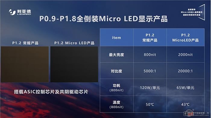 ASIC和驅(qū)動IC聯(lián)合開發(fā)量產(chǎn)。利亞德Micro LED全系列產(chǎn)品(P0.4~P1.8)搭載ASIC控制芯片及共陰驅(qū)動芯片,(以P1.2為例)同等功耗下亮度提升1.5倍,同等亮度下功耗降低40%,對比度提高3倍,真正實(shí)現(xiàn)兼顧顯示品質(zhì)與成本的最佳平衡。